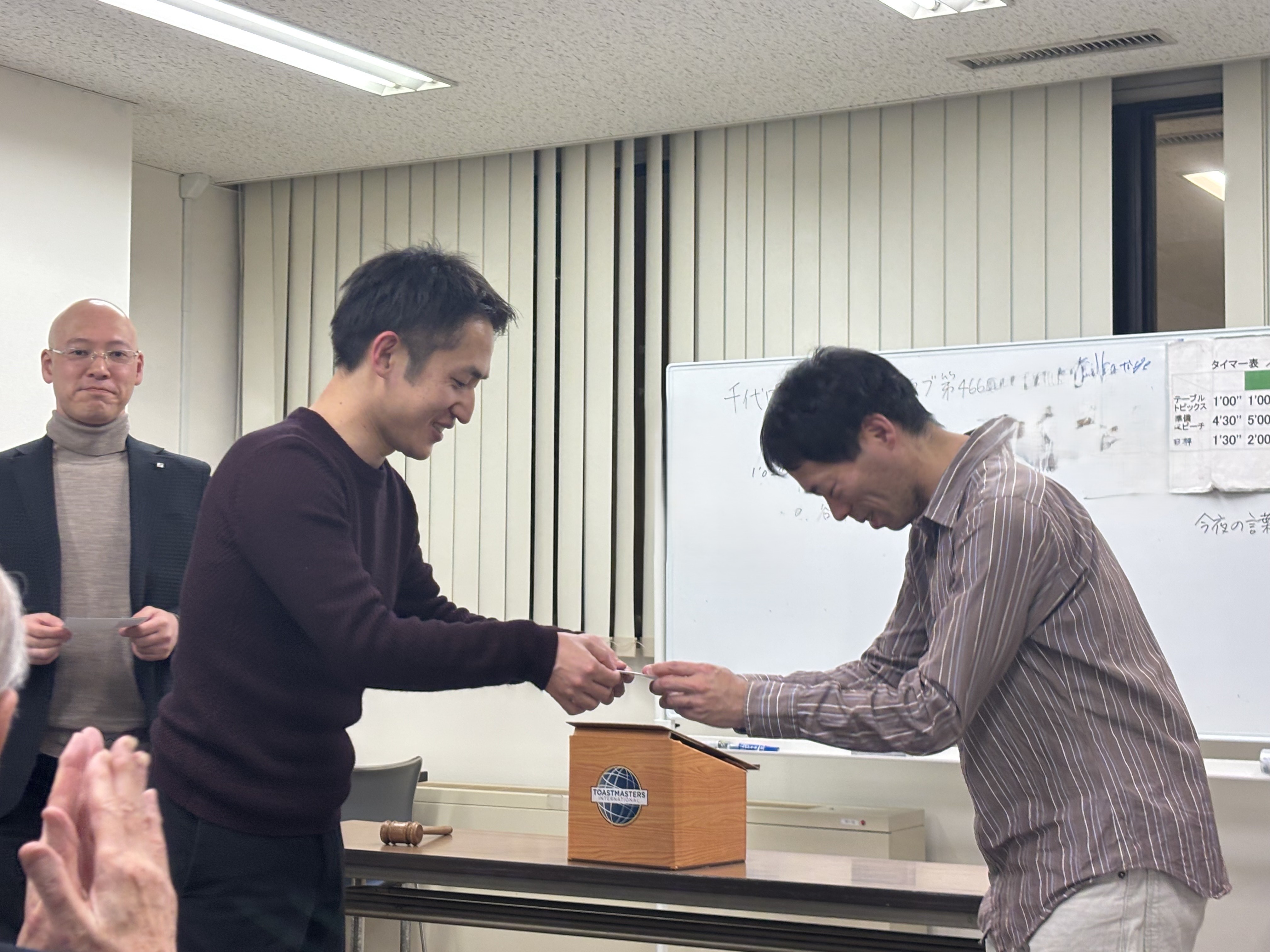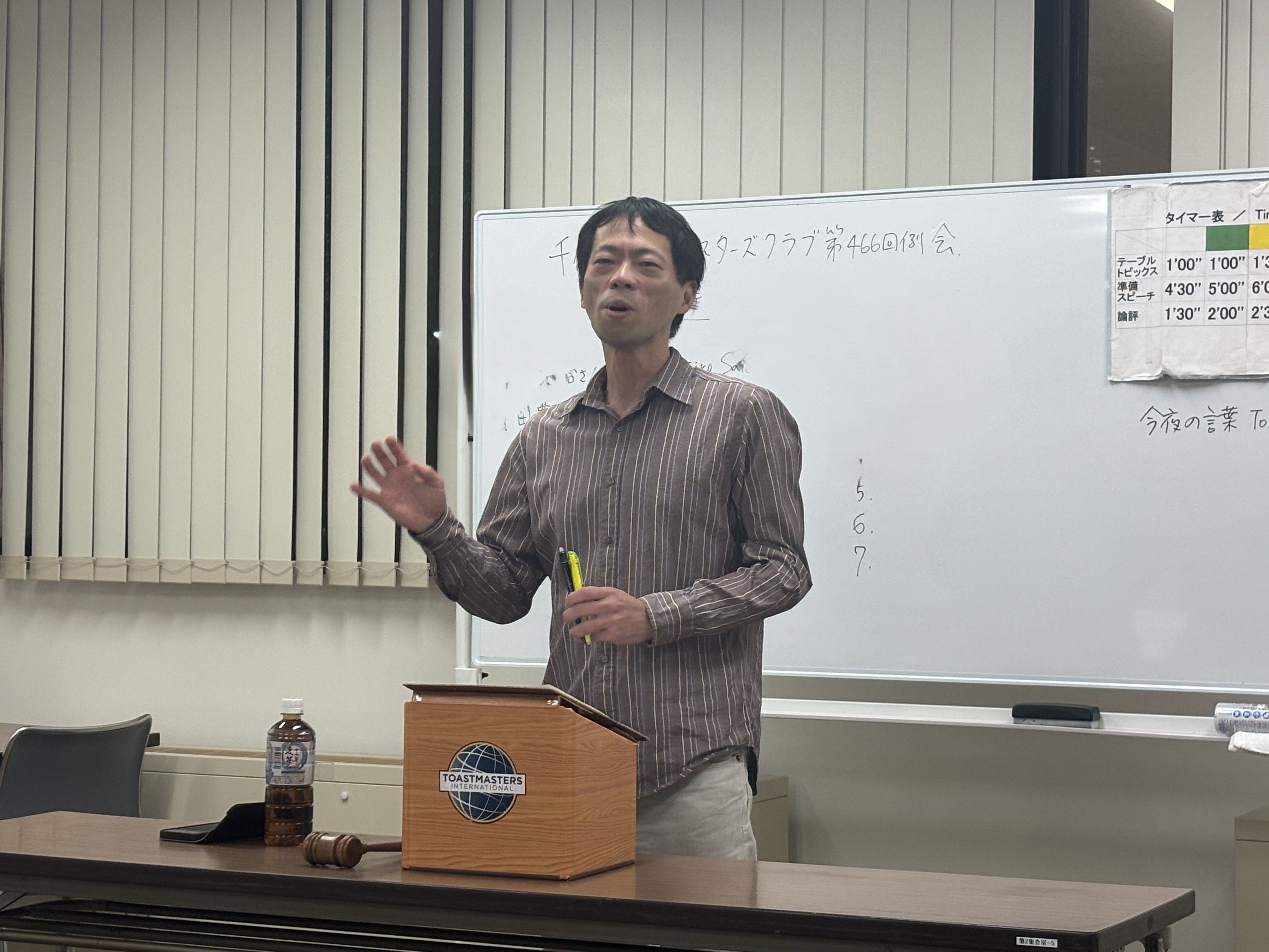 例会直前に欠席表明するメンバーもいましたが、そこはさすが我が千代田トーストマスターズクラブ。計時係をゲストのUさん、例会レポーターを私Fに瞬時に交代し、サポート係の紹介スピーチもつつがなく終わります。