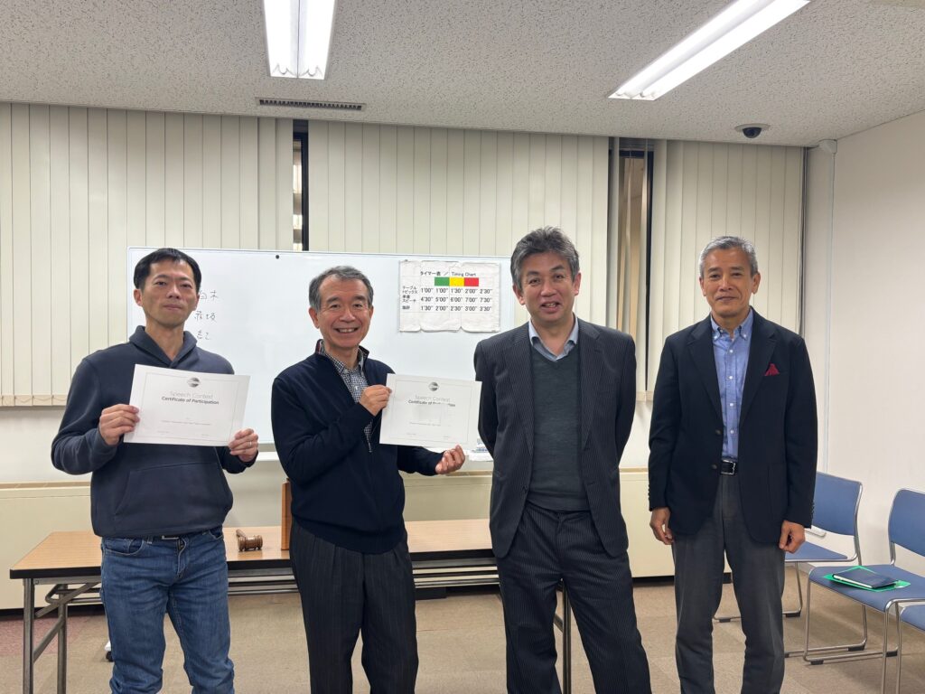 年が明けるとコンテスト出場者を決めるちょっと緊張する例会と、勝者が出場する上位レベルのコンテストがあります。クリスマス年末年始の休暇で充電しネタを暖めたメンバーのスピーチをお聞きになりたい方、是非千代田トーストマスターズクラブの例会へ見学にお越しください。