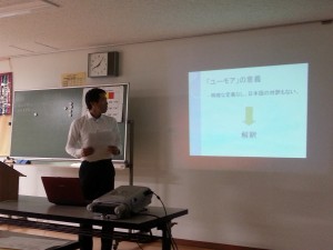 ユーモアスピーチについて分かりやすい資料を基に、ユーモアの題材は「悲劇と喜劇の共存」であること、