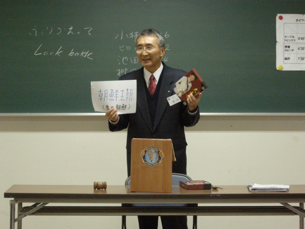 続いては、S山さんによる英語スピーチ。タイトルは「Chosun Dynasty(朝鮮王朝)」。S山さんが、マラソンにハマッているのは知っていましたが、韓流ドラマにもハマッていたとは!!(笑)。個人的に、韓流ドラマには全く興味がありませんでしたが、何故朝鮮で使われる箸が鉄製なのか?という素朴なギモンを解明する、鉄製箸のルーツのお話はとっても興味深かったです。筆者にこのような興味を抱かせたのは、内容もさることながら、スピーチ運びの巧みさにあるのでしょうね。