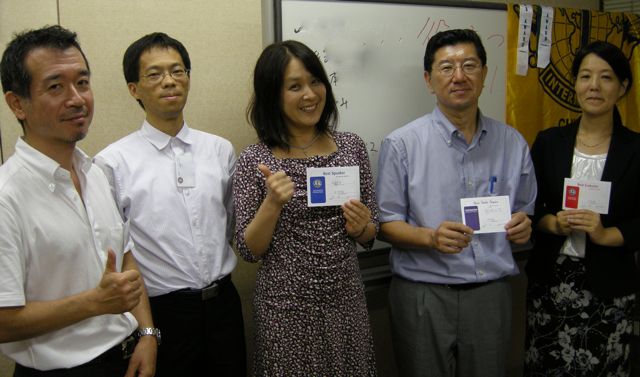 テーブルトピックスマスターは就職活動奮闘中のSさん。就職活動ではたくさんの出会いがあるそうで初めのお題は「新しい人と出会える場所」をゲストのG藤さん。表参道TMCで様々な出会いがあるそうです。「同じような人と出会う方法」をF沢さん。「最近であった面白い人」を見学者のS浦さんが就職面接を通して出会った人を紹介。「先生と思いがけないところで出会った」を見学者のS本さんがスピーチされました。