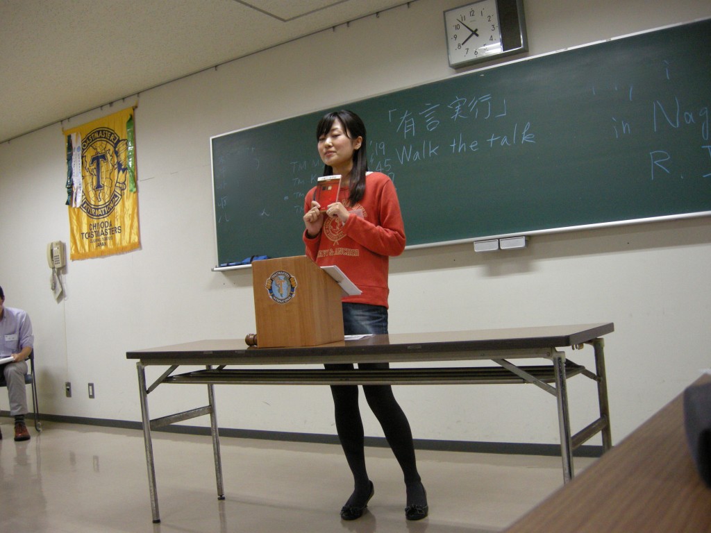 準備スピーチ二人目は、英語スピーチ初挑戦のI嵐さん。タイトルは「How do you enjoy this fall?」。最近ブームの「断捨離」。最初はやや半信半疑ながら、ご自身の本棚の本を必要なものだけに整理して断捨離を実行。本棚の「お嬢さん放浪記」を読みながら、著者の犬養道子氏の奮闘ぶりに再び勇気づけられ楽しいひとときを過ごすことができた、断捨離をしてよかったと振り返りました。そして、みなさんもぜひ手を挙げて断捨離を「Walk the talk」して下さい!と今夜の言葉を使い、ウマく最後を締めました。