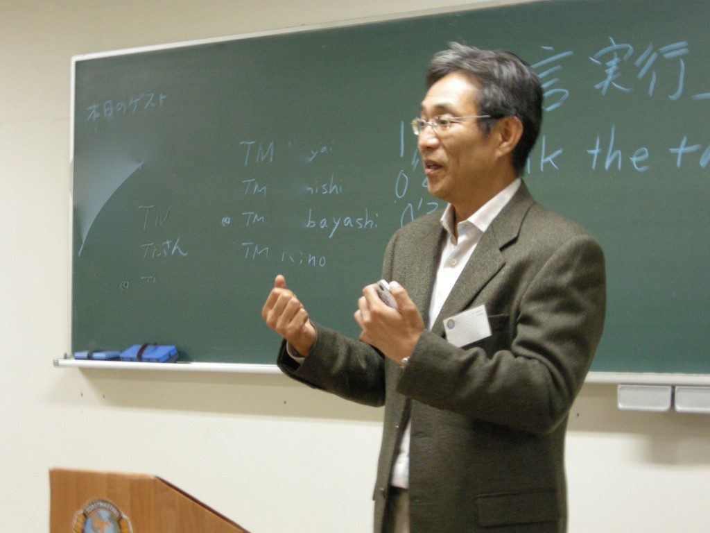 今日のTMOEはH岡さんです。東京マラソンの抽選に当選したというH岡さん、3時間を切るタイムを出しますと宣言し、今夜の言葉(キーワード)は、「有言実行」(walk the talk)に決まりです。