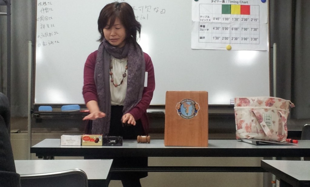 3番目はH川さんによる『Sweet Research』という英語スピーチでした。自分が好きなチョコレートがセールス的にも成功しており自分の舌は間違いなかったという内容で、持参されたお勧めのチョコレートは休憩時間にみんなで美味しくいただきました。